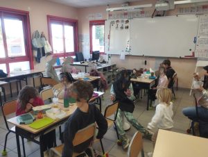 Les élèves étaient mélangés entre cycles pour déguster ensemble un repas sain composé de fromage blanc, muesli, banane, pain complet, beurre et jus d’orange. Les deux classes de maternelle avaient même préparé de la compote de pommes maison : pas moins de 15 kilos de pommes épluchées par leurs petites mains !
